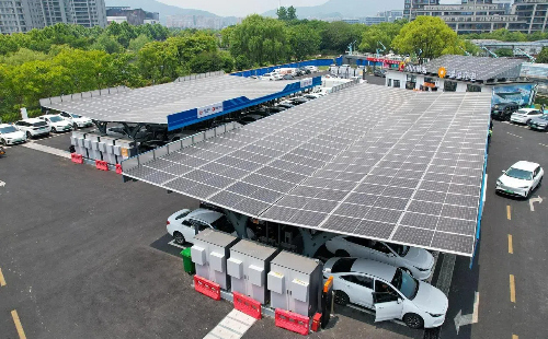 New energy vehicles are charged at a supercharging station with integrated solar storage in Hangzhou. [Photo/VCG]