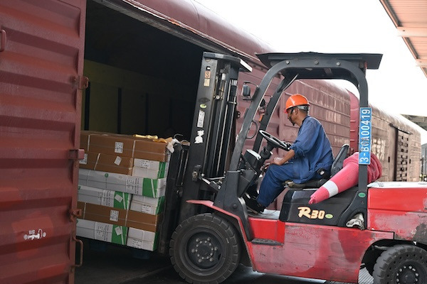 Goods are loaded onto a train. [Photo/tidenews.com.cn]