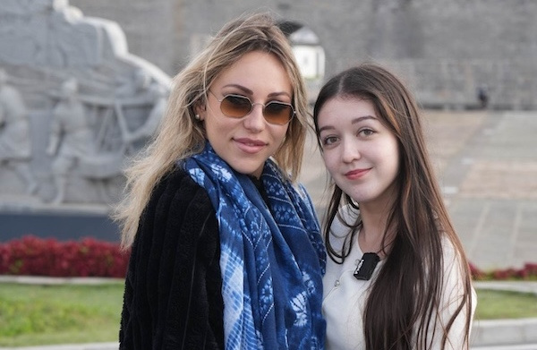 Von Roon Yasmin (L) and Cuesta Yanira Patricia (R) pose for a photo in front of the Ganpu Ancient Wall in Haiyan county, Jiaxing, Zhejiang province. [Photo/jiaxingren.com]