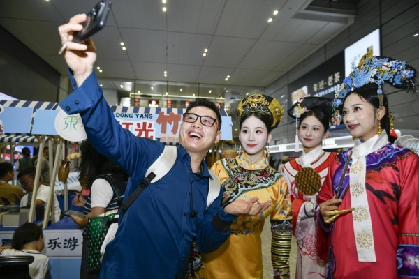 A passenger takes photos with actresses portraying characters from classic TV series at Shanghai Hongqiao Railway Station. [Photo/Tide News]