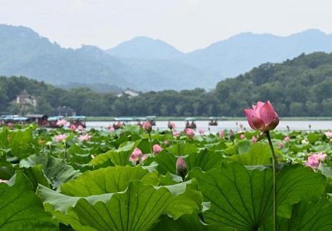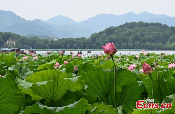 Lotus flowers bloom in succession against the backdrop of West Lake's surrounding hills in Hangzhou, Zhejiang Province, July 17. [Photo by Wang Gang/China News Service]