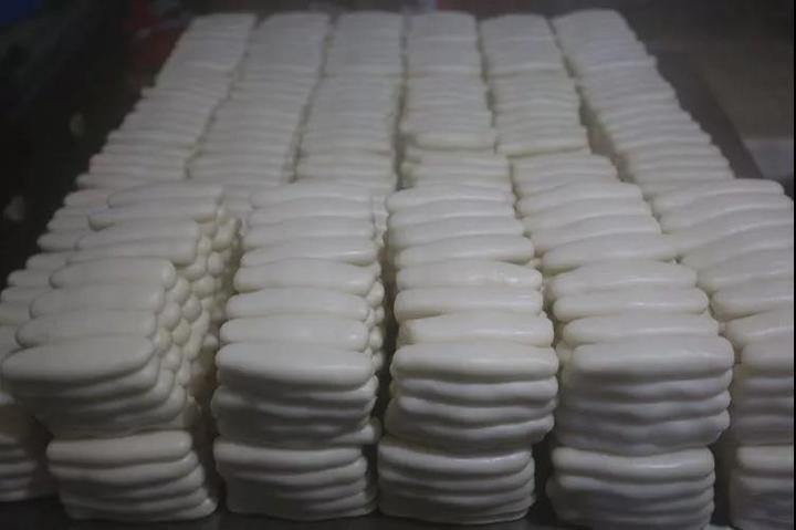 Rice cakes all around Shaoxing are subtly different, reflecting the local characteristics. For example, the rice cakes in Shengzhou are thicker and cut into strips; in Zhuji, for the convenience of storage, a parallel pattern is printed on the rice cake.