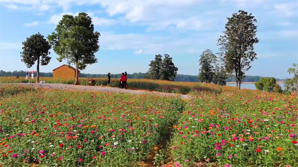 On November 9, by the Guolilong Reservoir, Wucheng District, Jinhua, large areas of galsang flower and cosmos sulphureus were in full bloom. Under the blue sky and white clouds, the beautiful sea of flowers attracted many people to take photos.