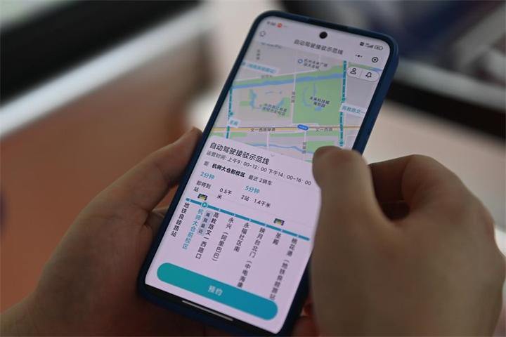 A citizen books a free trip on the autonomous driving minibus through a mobile phone application in Yuhang District, Hangzhou City, east China's Zhejiang Province, May 22, 2024. (Xinhua/Huang Zongzhi)