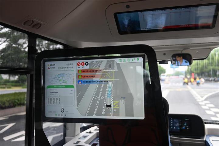A screen displays real-time road surface situation and operational information inside an autonomous driving minibus that runs on a road in Yuhang District, Hangzhou City, east China's Zhejiang Province, May 22, 2024. (Xinhua/Huang Zongzhi)
