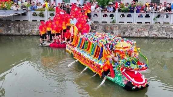 Taihu village in Hongqiao town, Changxing county, Huzhou was awash with vibrant hues as a stunning dragon boat, bedecked with an assortment of flowers and flags, set sail on May 23.
