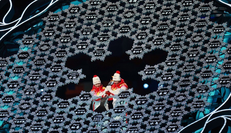 The 91 placards carrying names of each participating team came together to form one single, large snowflake, framed by olive branches. The huge snowflake, which later turned out to be the cauldron, demonstrated the traditional Chinese principle of people living in universal peace and harmony.