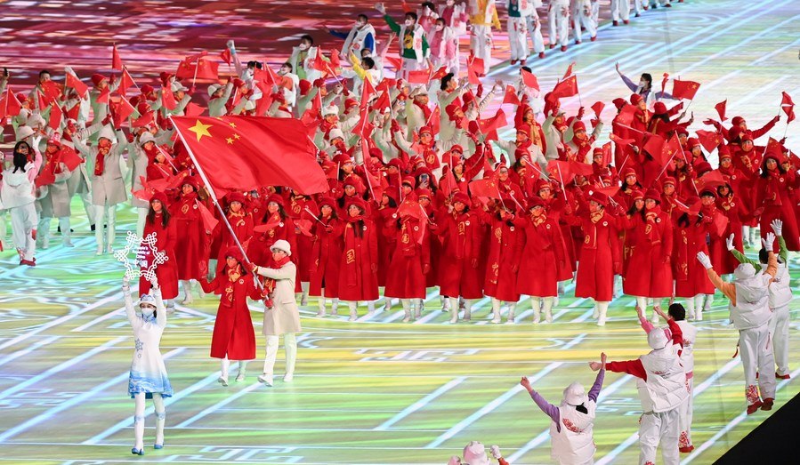 The Chinese delegation parades into the National Stadium during the opening ceremony of the Beijing 2022 Olympic Winter Games. (Xinhua/Xiong Qi)