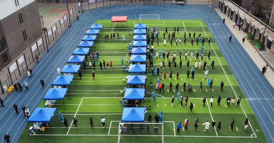 Aerial photo taken on Jan. 9, 2022 shows a COVID-19 testing site in Nankai District of north China's Tianjin. (Xinhua/Sun Fanyue)