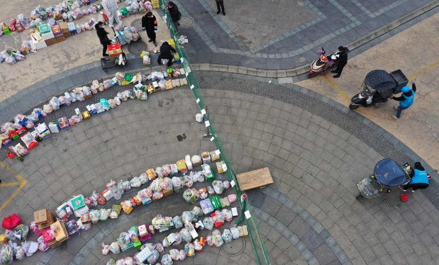 Aerial photo take on Jan. 12, 2022 shows government workers and volunteers receiving daily necessities ordered by residents under home quarantine in Yanta District of Xi'an, capital of northwest China's Shaanxi Province. (Xinhua/Tao Ming)