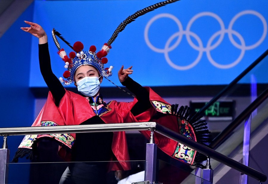 A volunteer in Peking Opera costume performs at the audience stand during the break of a women's ice hockey match at National Indoor Stadium in Beijing, China, Feb. 3, 2022. (Xinhua/Li Ziheng)