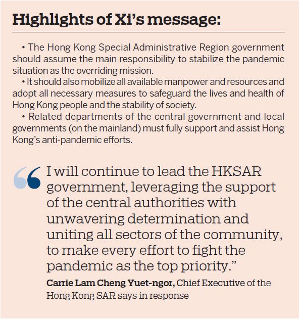 Recently, Xi expressed great concern about the city's raging outbreak and instructed the Hong Kong government to make pandemic control its top priority and take all necessary measures to overcome the virus.