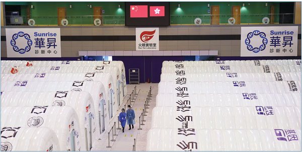 Medical staff inspect the temporary air membrane laboratory known as “Huo-Yan Laboratory” at the Ma On Shan Sports Centre. (Photo/China Daily)