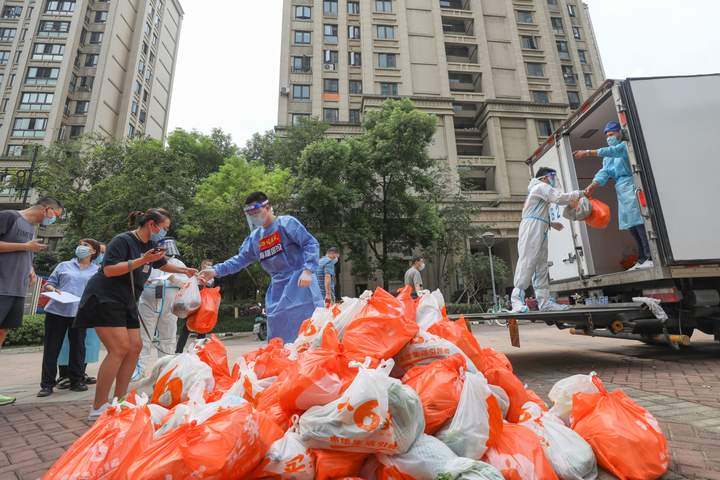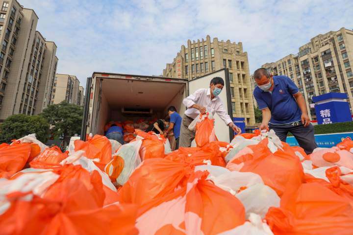 "The vegetables have arrived!" At around 7 am on September 27, nine bright orange lorries loaded with 4600 basic necessities arrived at the east, south and north entrances of Qinglin Bay West. At the entrance of the east gate, Zhao Bingquan, a member of Haishu Group's "Red Sea Commando" team, and other street and community workers saw them from afar and immediately ran up to meet them, carrying, counting, transporting and distributing them in an orderly manner.