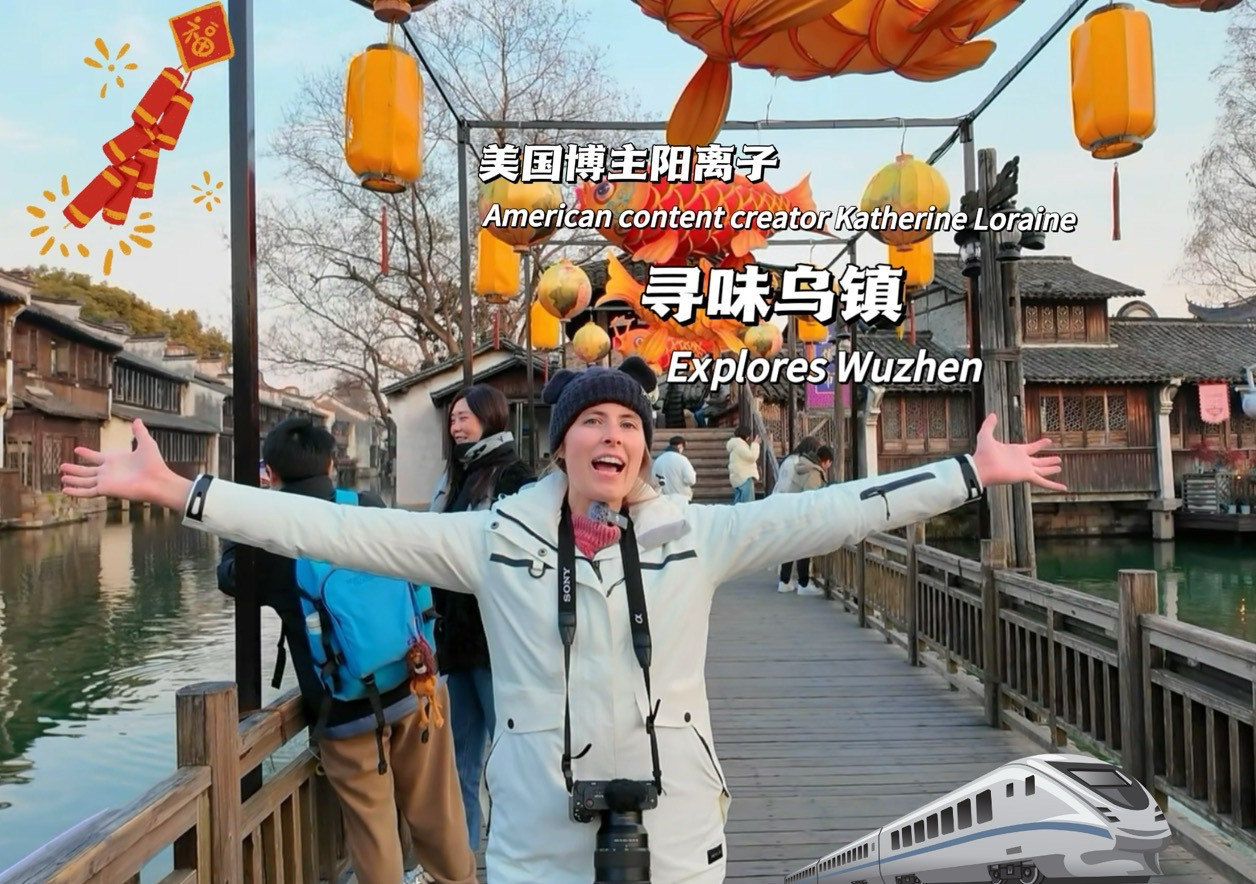 Recently, American content creator Katherine Olson visited Wuzhen, experiencing the early morning market, the New Year's fair, enjoying hot pot, and buying New Year's goods.