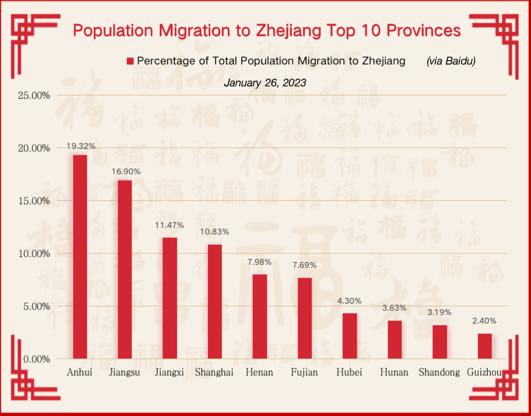 On January 26, Anhui rose to be the top province with the largest population migration to Zhejiang, followed by Jiangsu, Jiangxi and Shanghai.