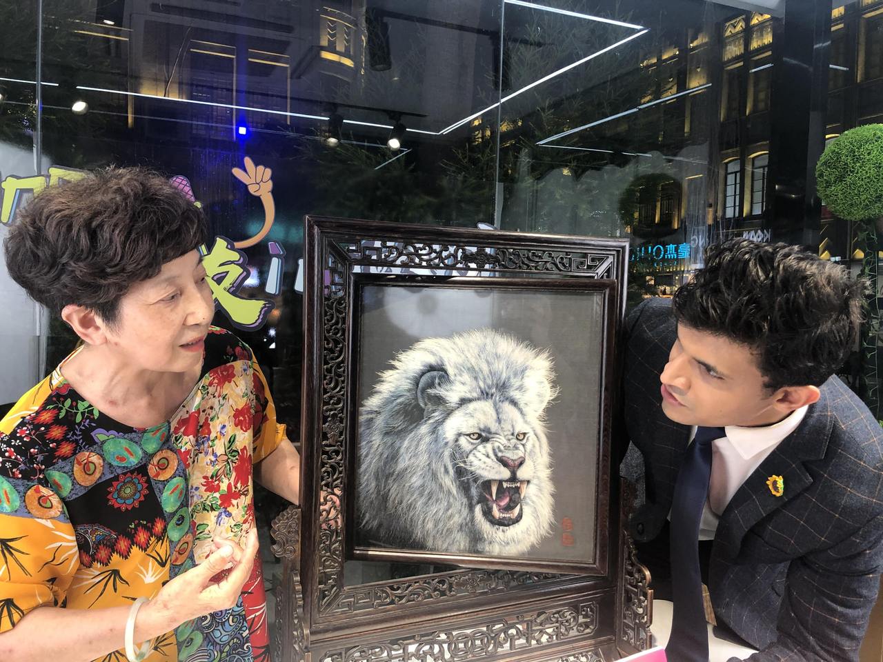Ms. Shi said that "The Mightiness of King," which especially takes the lion as the theme, is the first and only"double-sided, different-color, different-pattern” embroidery work in the history of Ou Embroidery. It takes 3 years to design and complete, overcoming countless technical problems in Embroidery such as double-sided layout, different-color application, and different-pattern setting. It presents both a lion’s awe-inspiring power in static pose and its domineering momentum in dynamic move on a single canvas. Brett was impressed so much by these masterpieces created by Ms. Shi Chengquan.