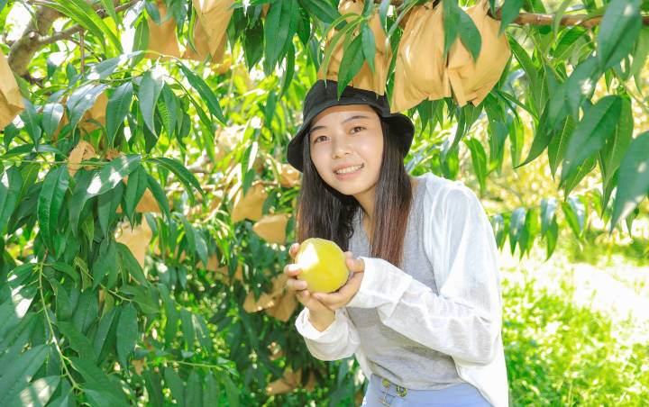 Running an orchard covering over 300 hectares, she brings out fruits from spring to winter continuously. Pink juicy peach, kiwi fruit with a red core, rose and gold-skin brin, all these are competing to hang on the trunk.