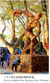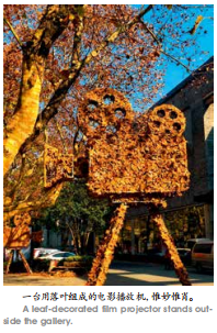 这是一场全民参与的社会美育嘉年华,一场席卷整个杭州城、化枯枝落叶为神奇的全城艺术节。除了中国美术学院正门口的《掷铁饼者》,旁边美院美术馆门口还有一台用落叶组成的电影播放机,你可以看到似鱼又似鸟的庞然大物鲲鹏、用金黄落叶汇集起来的《蝉蜕》,还有挂在中国美术学院南山校区中庭一串串优美的落叶帘。