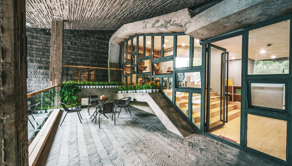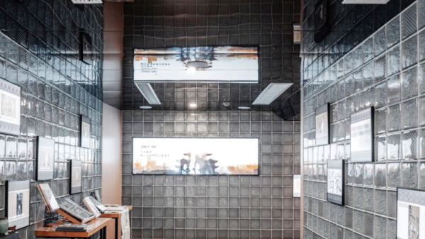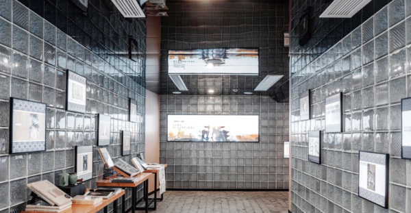 When people walk inside, their attention would only be caught: a short but zigzagging corridor, both sides covered with glass in water ripple patterns, as if forming a curtain, and creating the blurred effect of light and shadow day and night; electronic screens on the walls introducing figures, poems and paintings from the Southern Song dynasty, as well as books and porcelain products related to the period. Further inside, the space suddenly opens up. A flight of broad and giant staircases doubles as “seats” for readers and visitors — on the sides of each staircase are also embedded LED screens, showing video clips on the Southern Song. The flight leads straight to a book wall on the second floor and the gentle and warm color of the wood makes it look like a personal study room.