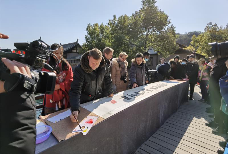 The author travels to Lanting or the Orchid Pavilion with his international friends and introduces stories of Chinese calligraphy behind the place on December 4, 2020