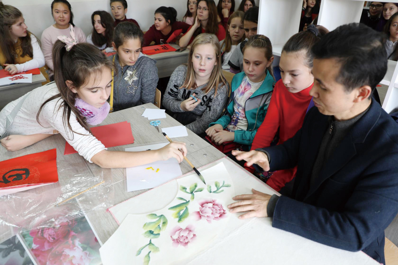 The author teaches local students to draw peonies in Bulgaria on November 23, 2017