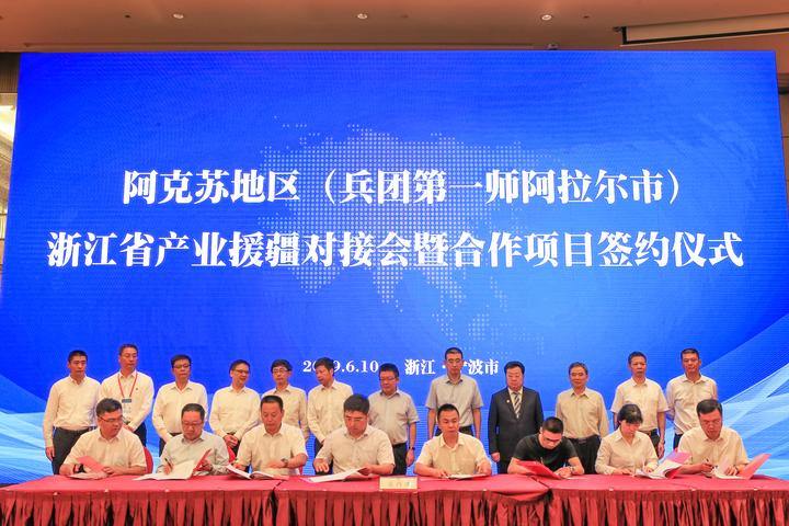 On the morning of June 10, the Industry Aid Conference & Signing Ceremony of Cooperation Project between Zhejiang Province & Aksu Area (Alaer City of First Division of the Corps) was held in Ningbo, where 24 projects were signed with a total worth of 6.184 billion yuan, covering such fields as energy and chemical, textile and garment, agricultural and sideline product processing, real estate, building materials and equipment manufacturing, with the signed amount of a single project up to 1.8 billion yuan.