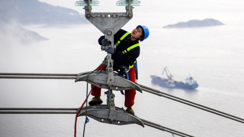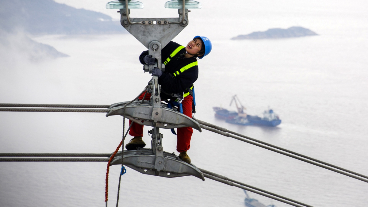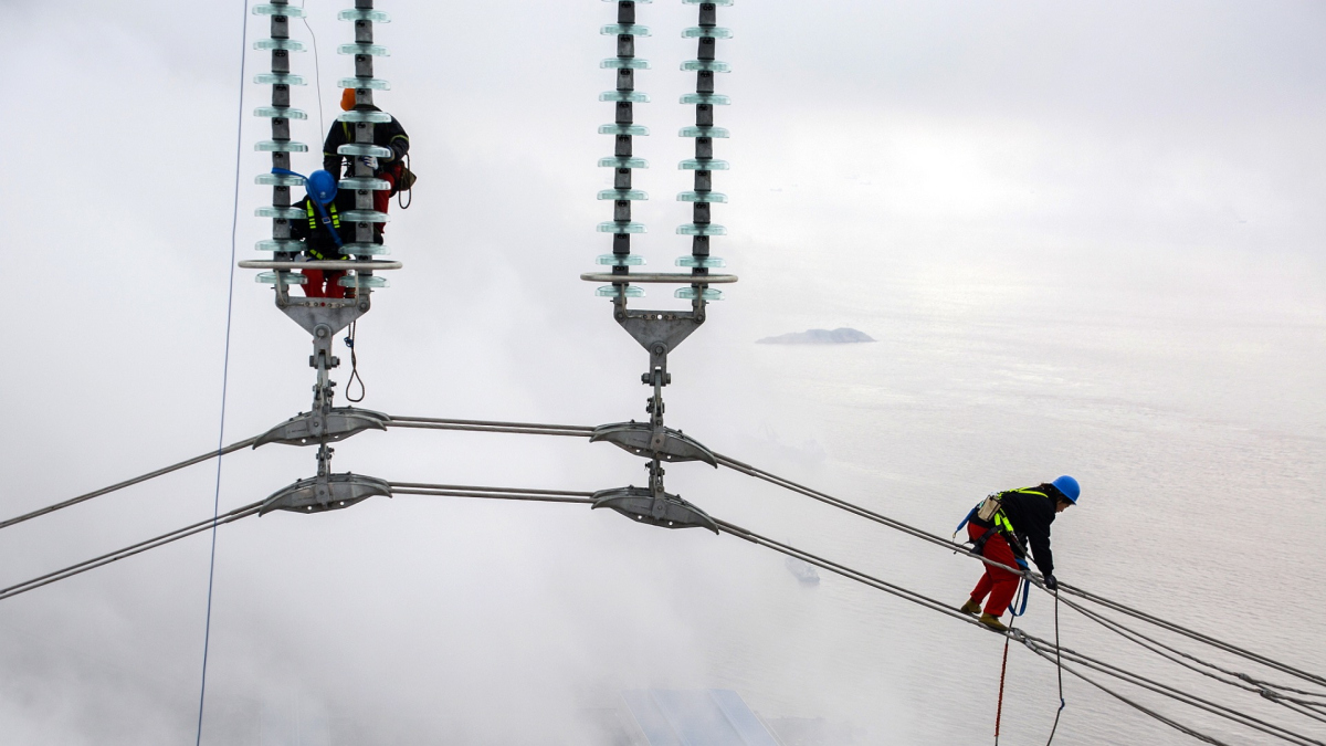 Electricians carried out the final check on transmission towers over 380 meters above sea on Sunday before their trial run begins on January 7 on the Zhoushan Islands, east China’s Zhejiang Province.